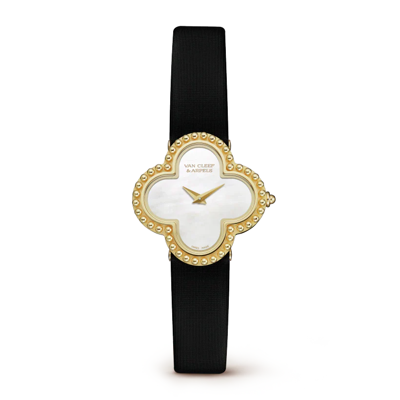 アルハンブラ スモールモデル ウォッチ、ケースサイズ26mm x 26mm、18K イエローゴールド、18K イエローゴールドのベゼル、ホワイトマザーオブパールの文字盤、18K イエローゴールドのリューズ、ブラックサテン ストラップ、18K イエローゴールドのピンバックル、クォーツムーブメント