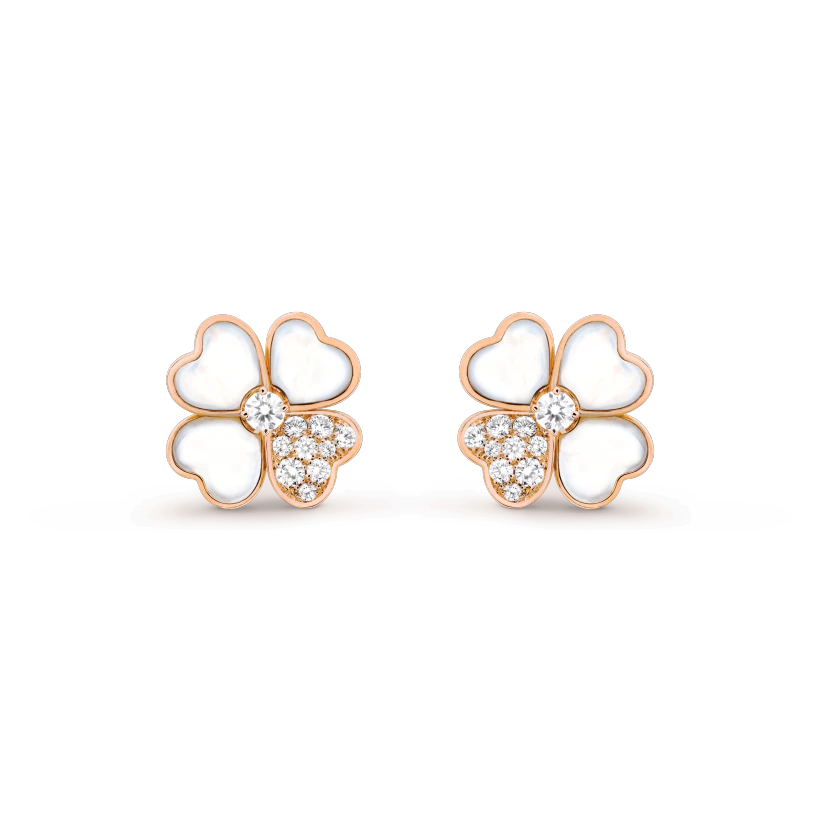 コスモス イヤリング、スモールモデル、ローズ ゴールド、ホワイト マザーオブパール、ラウンドカット ダイヤモンド、カラー:DEF、クラリティ:IF~VVS