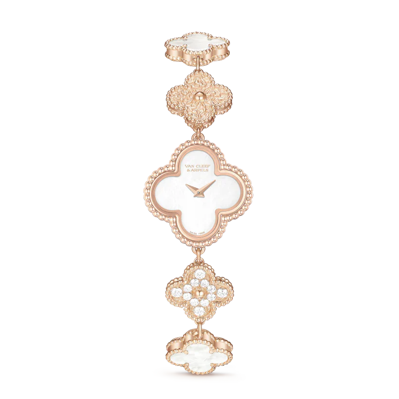 スウィート アルハンブラ ウォッチ。22.7mm x 22.7mmの18K ローズゴールド製ケース。18K ローズゴールドのベゼル。ホワイトマザーオブパールの文字盤。18K ローズゴールドのブレスレット、ラウンドカット ダイヤモンド、ホワイトマザーオブパール。ダイヤモンド DEF IF~VVS。クォーツ ムーブメント。