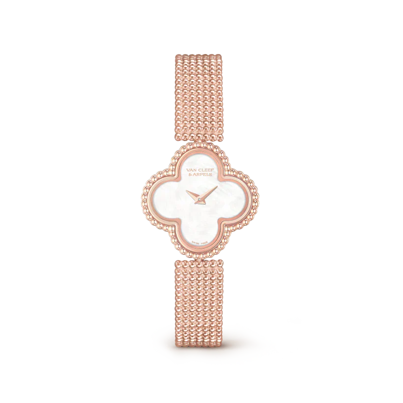 スウィート アルハンブラ ウォッチ。22.7 x 22.7 mm 18K ローズゴールド製ケース。18Kローズゴールド製ベゼル。ホワイトマザーオブパールの文字盤。交換可能な18Kローズゴールド製ブレスレット。18Kローズゴールド製フォールディングバックル。スイス製クォーツムーブメント