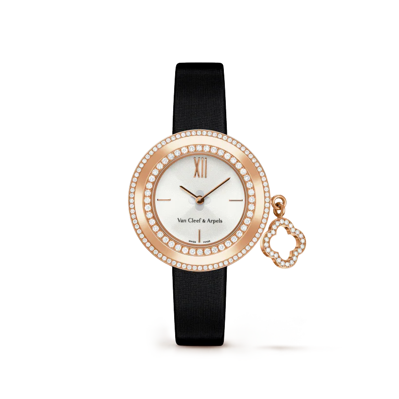 チャーム ミニ(25mm) ケースの直径25mm、18K ローズゴールド、18K ローズゴールドのベゼル、2列のダイヤモンド、回転する18K ローズゴールドのチャーム、ラウンドダイヤモンド、クリームラッカーの文字盤、アルハンブラ モチーフ、18K ローズゴールドのリューズ、ラウンドダイヤモンド、交換可能なホワイトまたはブラックのサテンストラップ、18K ローズゴールドのピンバックル、ラウンドダイヤモンド、DEFのダイヤモンド、IF~VSS、クォーツムーブメント