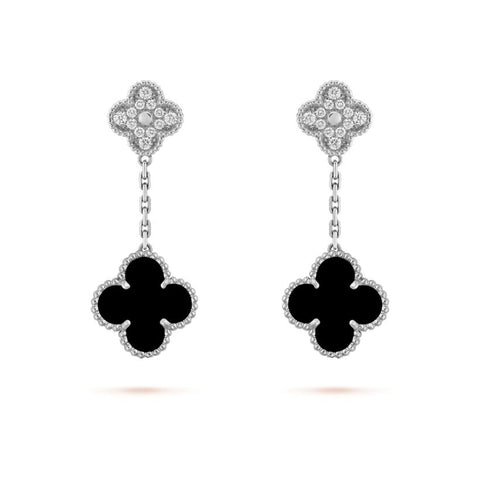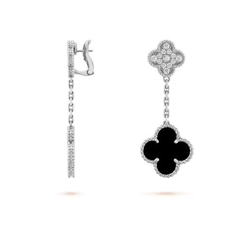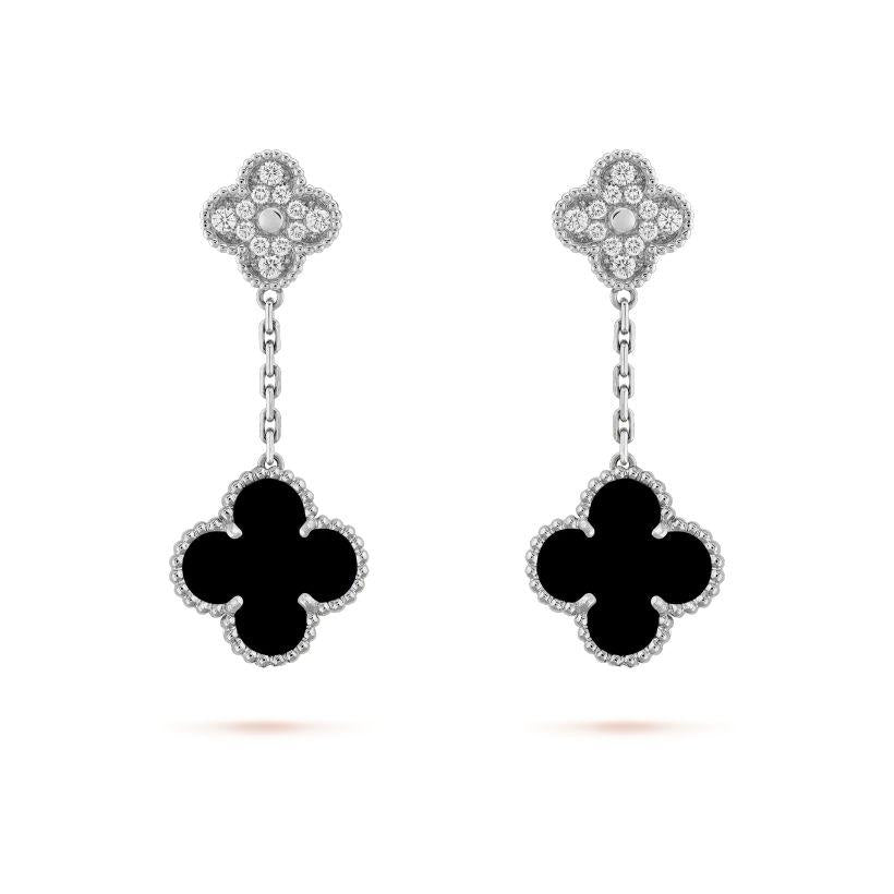 マジック アルハンブラ イヤリング、2 モチーフ、ホワイトゴールド、オニキス、ラウンドカット ダイヤモンド;ダイヤモンドのクオリティ DEF IF ~ VVS。