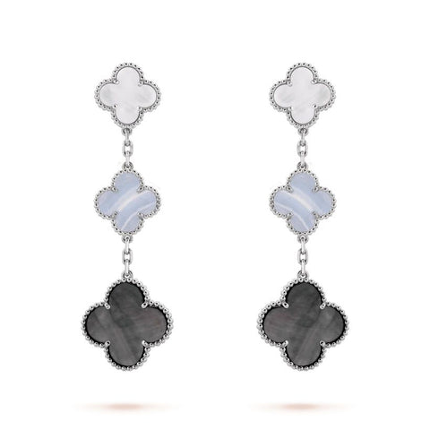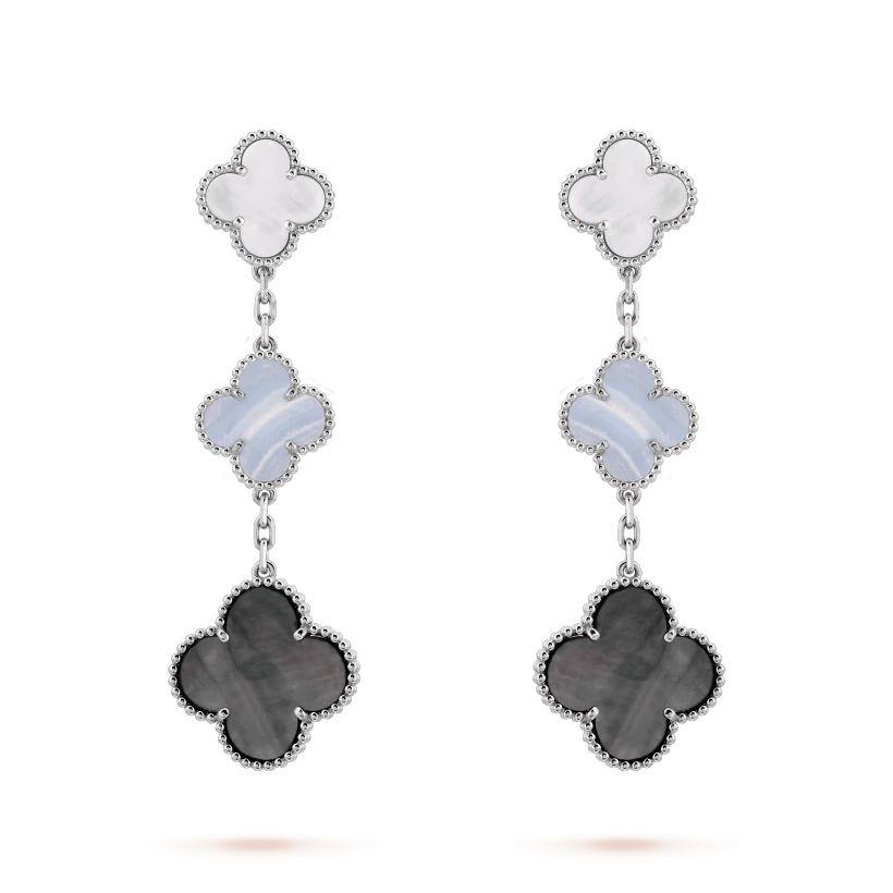 マジック アルハンブラ イヤリング、3モチーフ、ホワイトゴールド、ホワイト&グレー マザーオブパール、カルセドニー