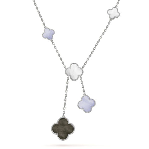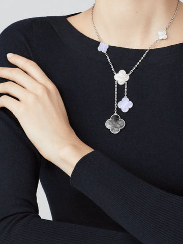 マジック アルハンブラ ネックレス、6モチーフ、ホワイトゴールド、ホワイト&グレー マザーオブパール、カルセドニー