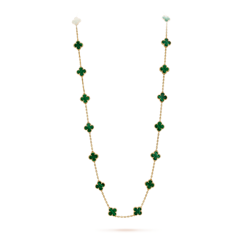 ヴィンテージ アルハンブラ ロングネックレス、20モチーフ、イエローゴールド、マラカイト