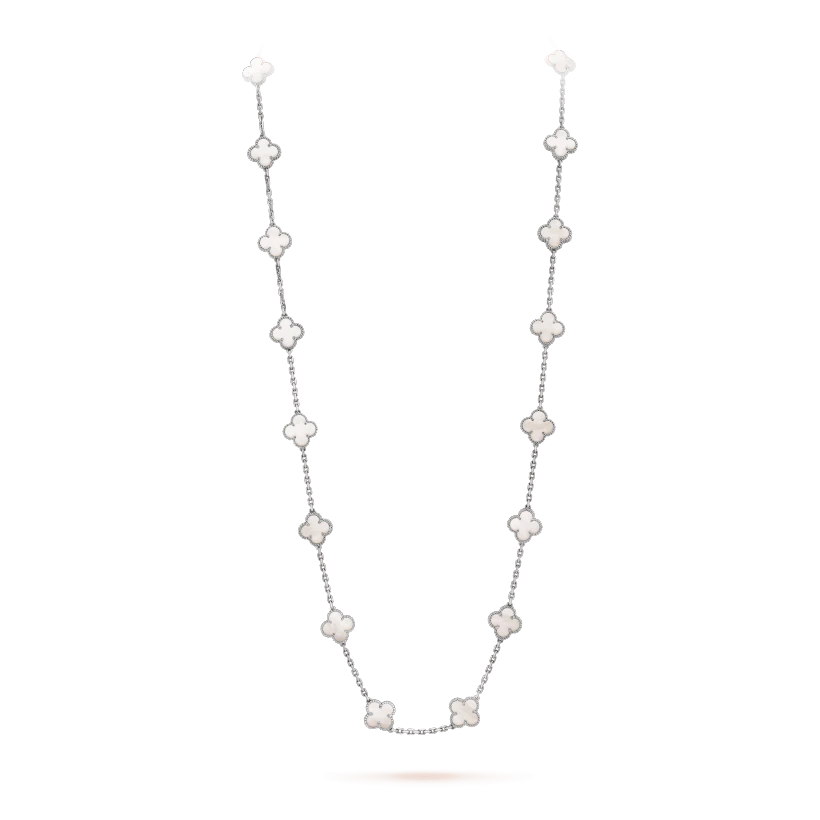 ヴィンテージ アルハンブラ ロングネックレス、20モチーフ、ホワイトゴールド、ホワイト マザーオブパール
