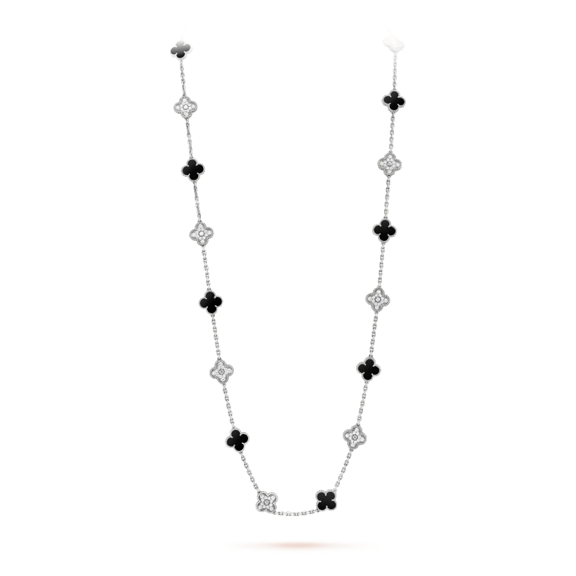 ヴィンテージ アルハンブラ ロングネックレス、20モチーフ、ホワイトゴールド、オニキス、ラウンドカット ダイヤモンド、ダイヤモンドのクオリティ DEF IF~VVS
