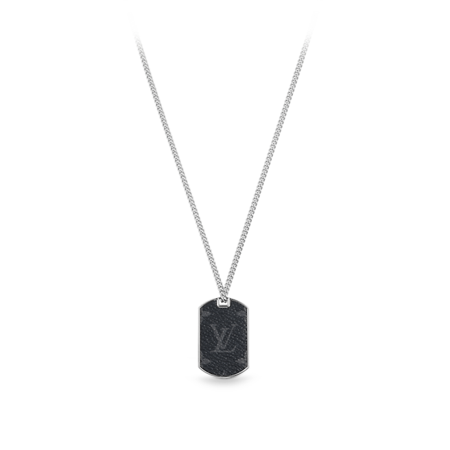 象徴的なモノグラムエクリプスキャンバスに金属のアクセントで包まれたこのネックレスは、洗練された男らしさを示しています。 蝶番を付けられた開閉設計のネームプレートペンダントは、着用者に隠された収納ポイントを提供します。