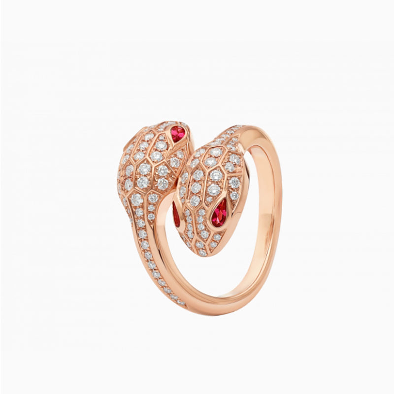 ルベライトとパヴェダイヤモンドをあしらった18K ピンクゴールド製セルペンティ セドゥットーリ ダブルヘッド リング。