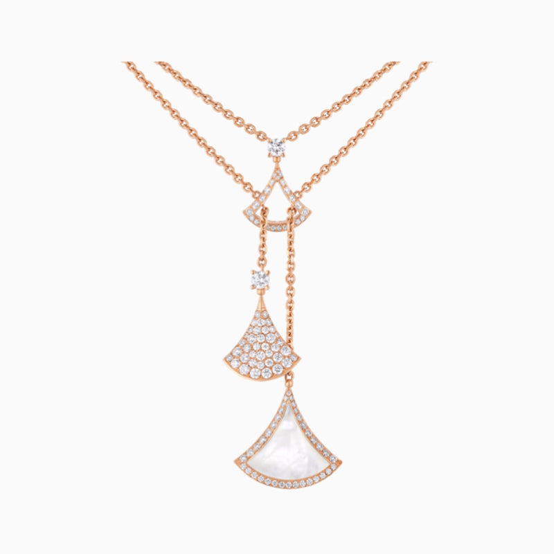 • イタリアの魅力をエレガントに描いた18Kピンクゴールド製ディーヴァ ドリーム ネックレス。ローマの精神を持ち合わせた魅力的なディーヴァたちに敬意を表したネックレスです。 女性らしいエレガンスにインスパイアされた、コレクションの象徴とも言える扇型のモチーフを、オープンワークのエレメント1つ、ペンダントヘッド2つの3ヶ所にあしらいました。うち、ペンダントヘッド1つにはマザー・オブ・パールのエレメント、もう1つにはパヴェ ダイヤモンドをセットしました。 ローマの遺跡、カラカラ浴場のモザイクが織り成す官能的なデザインを想起させるこの個性的なモチーフは、時を超えても褪せることのない美しさを賛美しています。