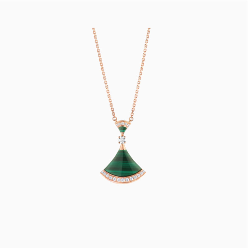 • フェミニンなエレガンスと永遠の都の魅力からインスピレーションを得たディーヴァ ドリーム ネックレス。紛れもないローマのスピリットを持つ魅惑的なディーヴァたちにオマージュを捧げています。まさにフェミニンで洗練されたネックレス。カラカラ浴場の大理石の壮麗さと、その扇型のモザイクのセンシュアルな曲線を捉えて作られました。イタリアン・ビューティーの真髄を表現しています。 マラカイトとダイヤモンドを使用した18Kローズゴールド製ディーヴァ ドリーム ネックレス。中心のダイヤモンドに付いた扇型のパーツは、縦横2cm。
